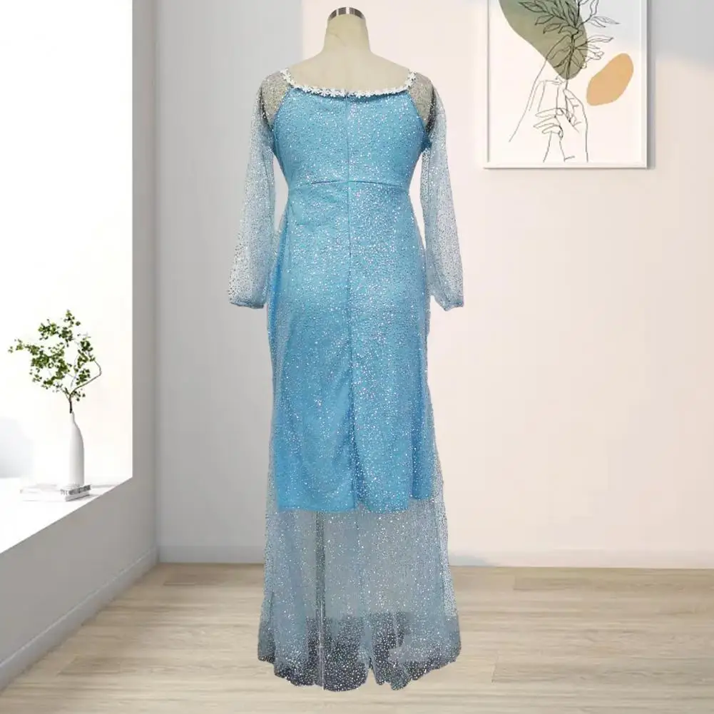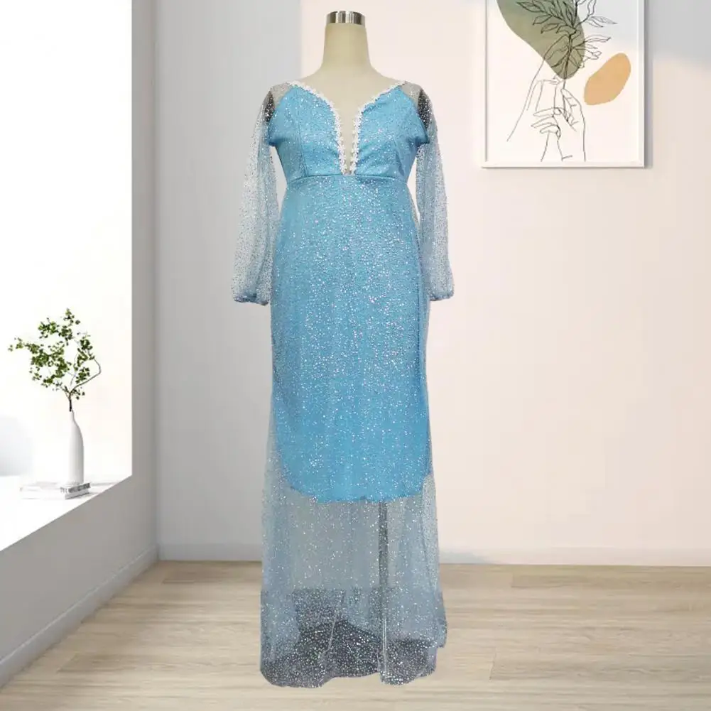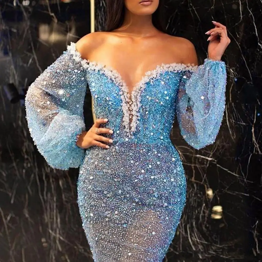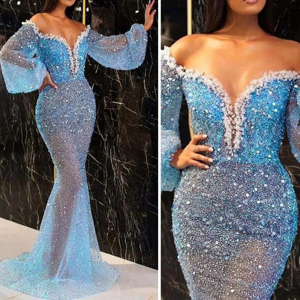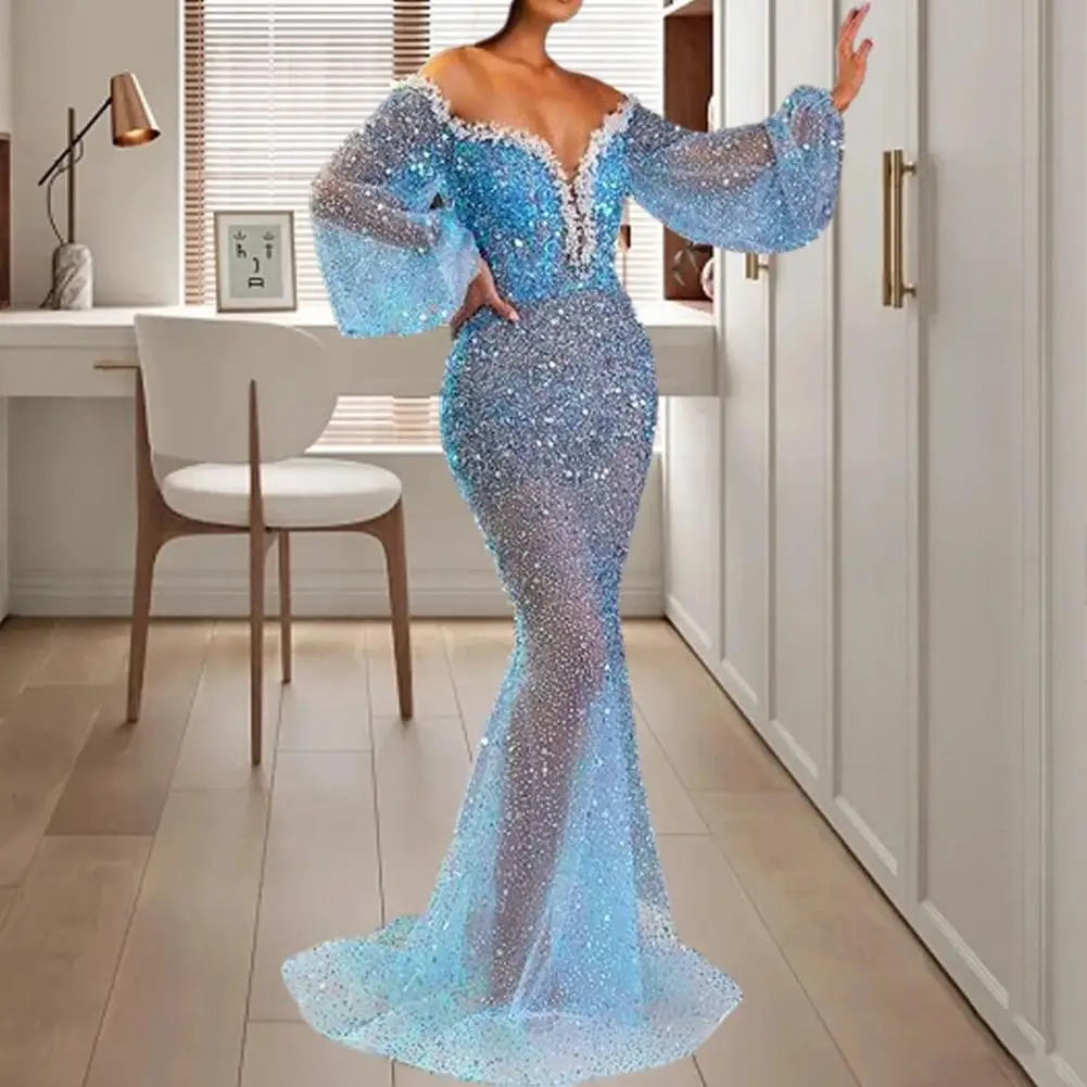 Women V-neck Fishtail Dress Off Shoulder V-neck Puff Long Sleeve Gown Dress Elegant Sequins Decor See-through Dress
