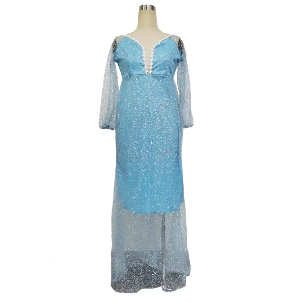 Women Elegant Gown Dress Off Shoulder V-neck Puff Long Sleeve Floor Length Dress Sequins Decor See-through Elegant Vintage Dress